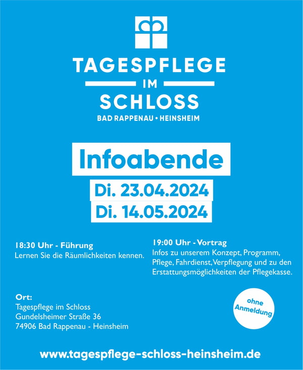 Aktuell sind noch einzelne Plätze in der Tagespflege verfügbar. Interessierte können unabhängig von den Infoabenden auch ein individuelles Beratungsgespräch oder einen Schnuppertag über tagespflege@sozialstation-badrappenau.de, Tel. 07264 / 92030210 oder über das Kontaktformular auf www.tagespflege-schloss-heinsheim.de/anmeldung vereinbaren.